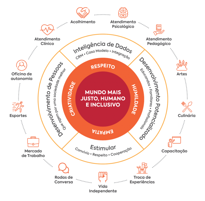 Isso é feito por meio da integração de ações de saúde – fisioterapia, terapia ocupacional, fonoaudiologia, psicologia; pedagogia, atividades culturais e de vivências, mobilização para autonomia, educação financeira, projeto talento apoiado, entre outros.