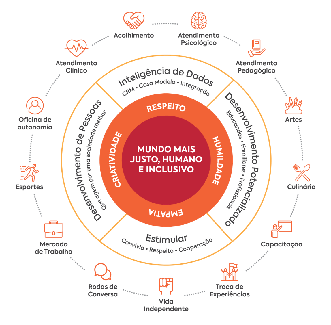 Empatia para integração – Visão sistêmica – Integração das áreas de saúde, vivências e mobilização para autonomia, contato pessoal e organizado com os familiares e profissionais das pessoas com deficiência, relacionamento/networking com empresas e poder público.
