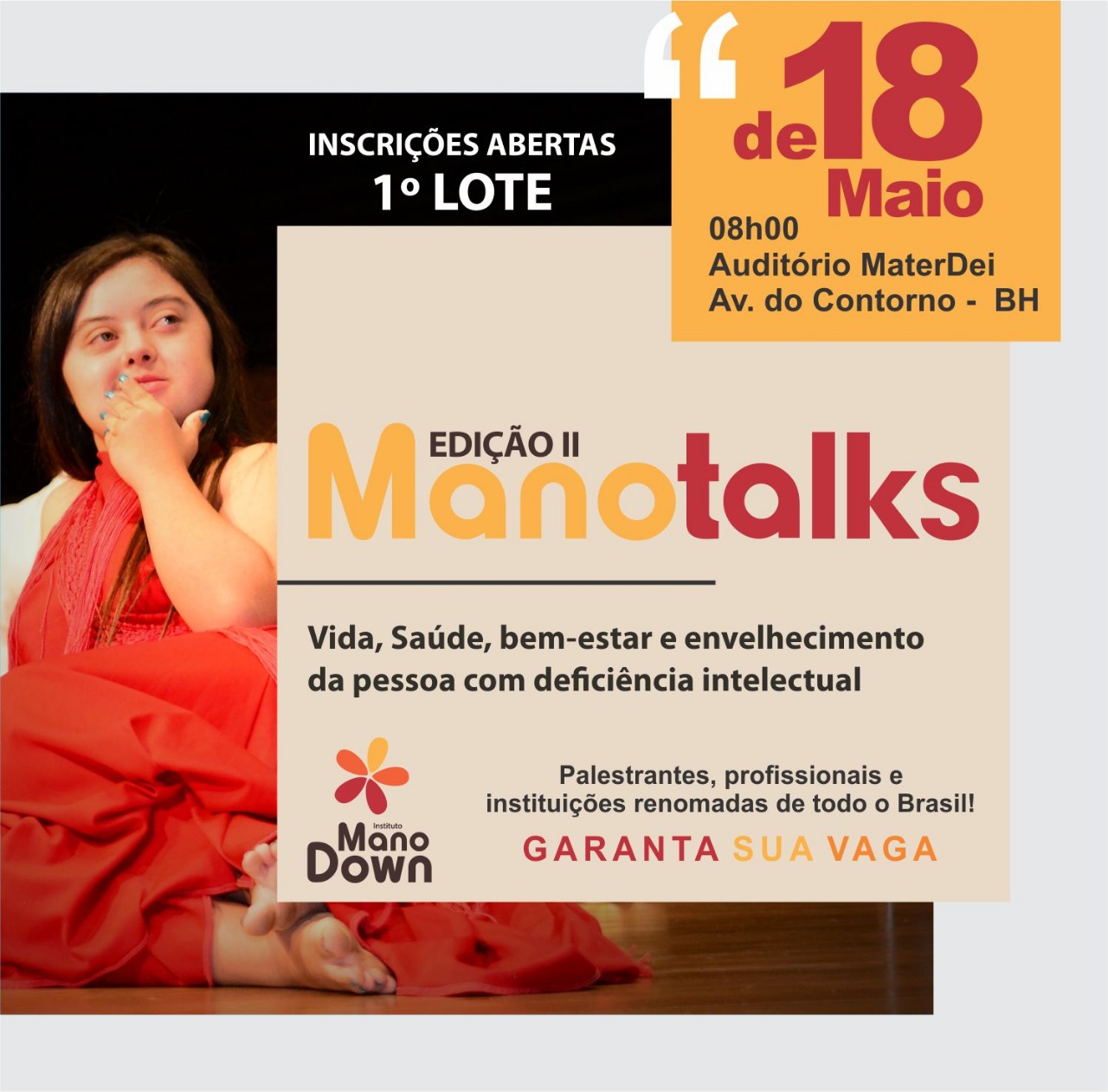 ▶IMPORTANTETodo o VALOR arrecadado com as inscrições do Mano Talks será destinado para a compra de equipamentos e materiais usados nos atendimentos de saúde do Mano Down – fisioterapia, terapia ocupacional e fonoaudiologia; que são oferecidos gratuitamente para crianças e bebês.