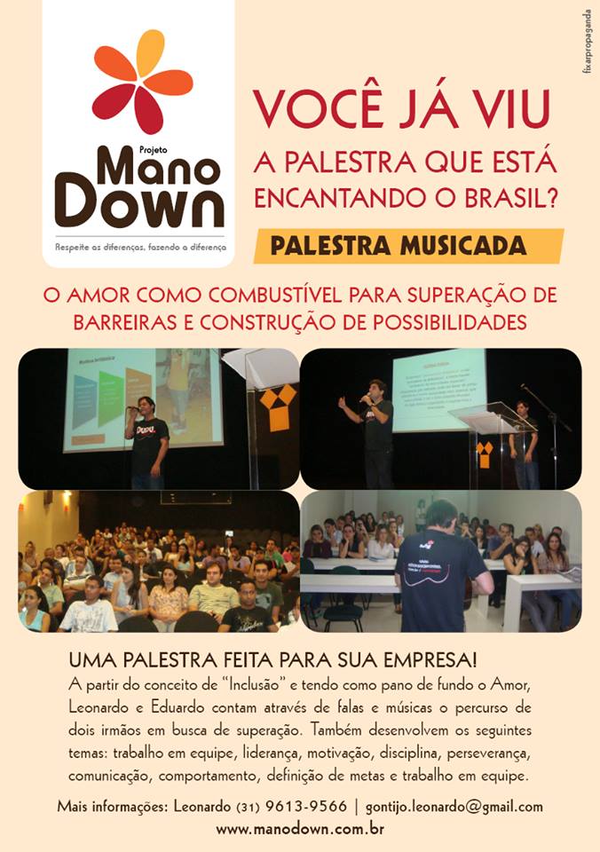 Uma ótima oportunidade para empresas e SIPAT. A partir do conceito de “Inclusão” e tendo como pano de fundo o Amor Leonardo (autor do livro Mano Down: Relatos de Um Irmão Apaixonado) e Eduardo contam através de falas e músicas o percurso de dois irmãos em busca de superação. Relatam trajetórias de vida que se cruzam.Também desenvolvem os seguintes temas: trabalho em equipe, liderança, motivação, disciplina, perseverança, comunicação, comportamento, definição de metas e trabalho em equipe.