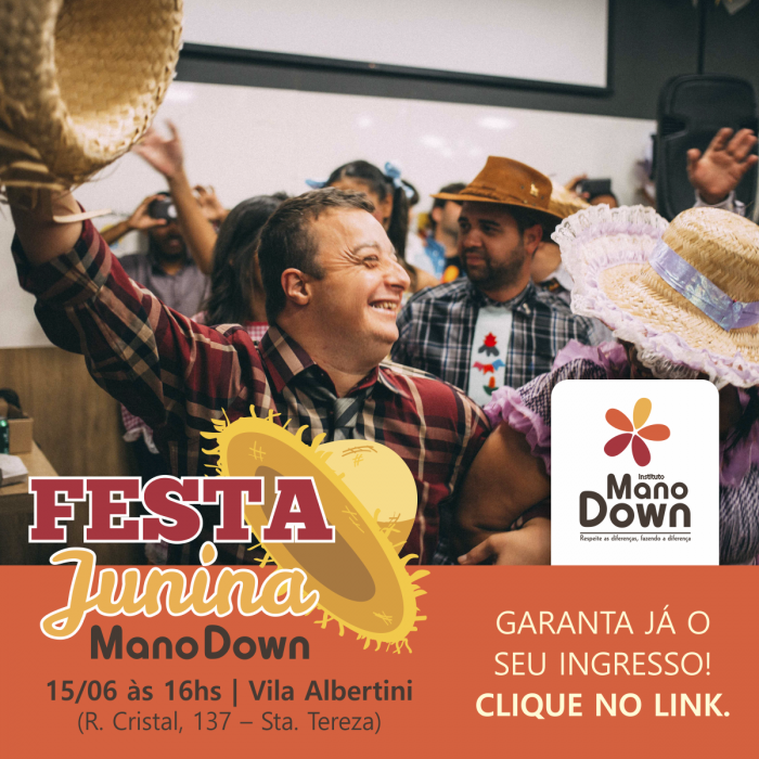 Neste sábado, dia 15 de junho, a partir de 16h, acontecerá a já famosa festa junina do Mano Down. Teremos comidas e bebidas típicas, música, brincadeiras e a tradicional quadrilha dos educandos da entidade. Além de se divertir, o público terá a oportunidade de ajudar os programas do Instituto.